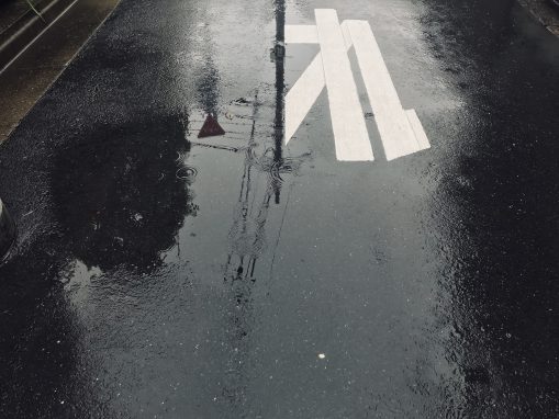 これは雨の日に撮ったものですが、水たまりの中に反射している「止まれ」の文字を見てください。「止まれ」が鏡文字になっているので、もしこの景色にタイトルをつけるとすれば「進め」です。